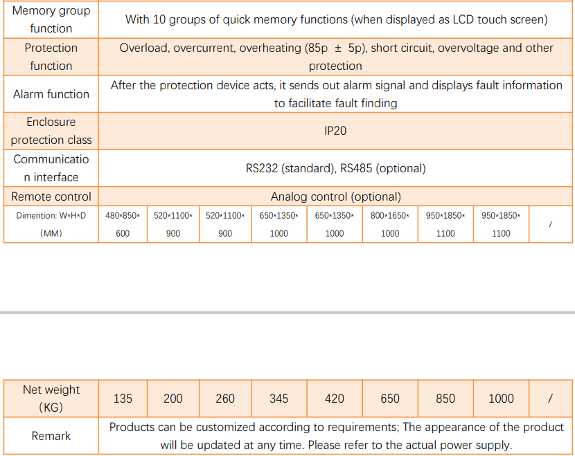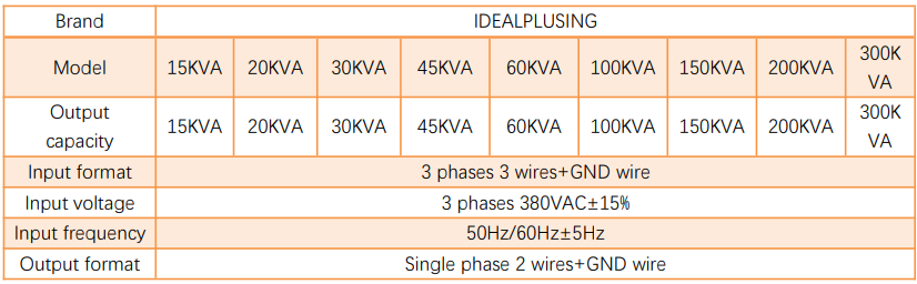 "① AC INPUT: 3 phases 380VAC±15% ② Output capacity: 300KVA ③ Output frequency: 50Hz, 60Hz; FM 45-400hz, ④ Machine size: L950*W1850*H1100(MM) ⑤ NW: 250KG, GW: 3000KG ⑥ Protection:Overload, overcurrent, overheating (85p ± 5p), short circuit, overvoltage and other protection ⑦ Package: Pearl cotton and carton double protection"