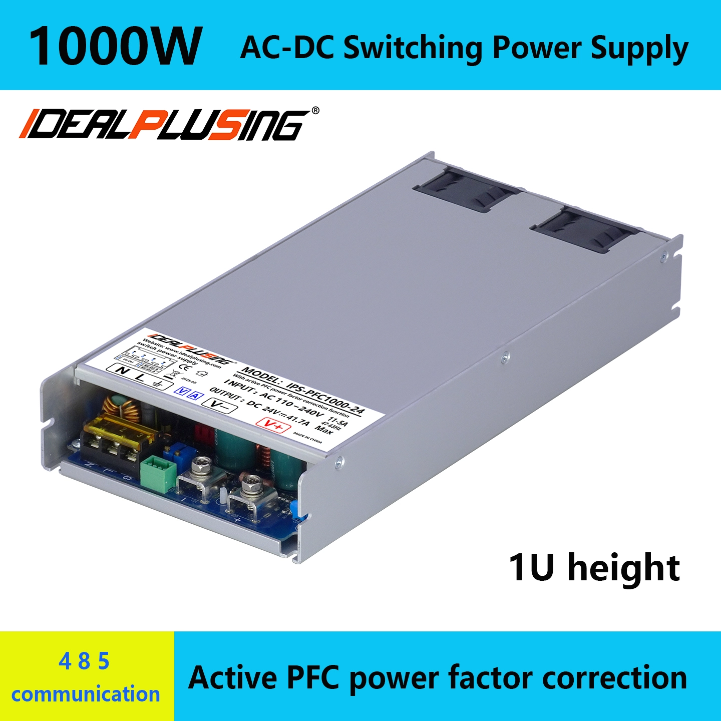 MODEL:IPS-PFC1000-24 24VDC 41.7A 1000W Switching power supply SPECIFICATION: ① AC input: Single phase 110 / 240VAC ± 15% 47 / 63Hz ② DC output: 24VDC, 41.7A ③ Max power: 1008W ④ Machine size: L268W131H41(MM) ⑤ NW: 1.4KG, GW: 2.5KG ⑥ Communication: RS485*1 ⑦ PFC power factor correction function ⑧ Package: Pearl cotton and carton double protection Wechat Number/Whatsapp ID: +86-18928830209 Email: info@idealplusing.com Office telephone number:+86-20-89282095